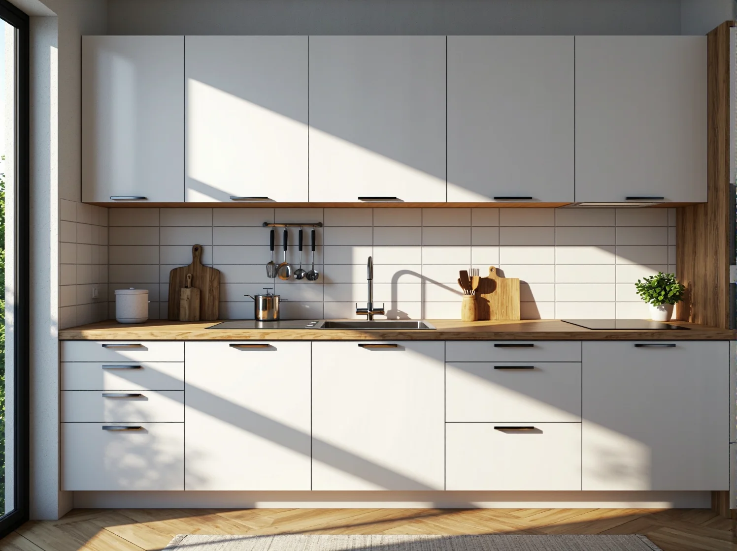 - Biel w różnych odcieniach: Klasyczna biel, kość słoniowa czy perłowy biały to najlepsi przyjaciele małych kuchni. Białe fronty mebli sprawiają, że granice między szafkami a ścianami zacierają się, co optycznie powiększa przestrzeń.