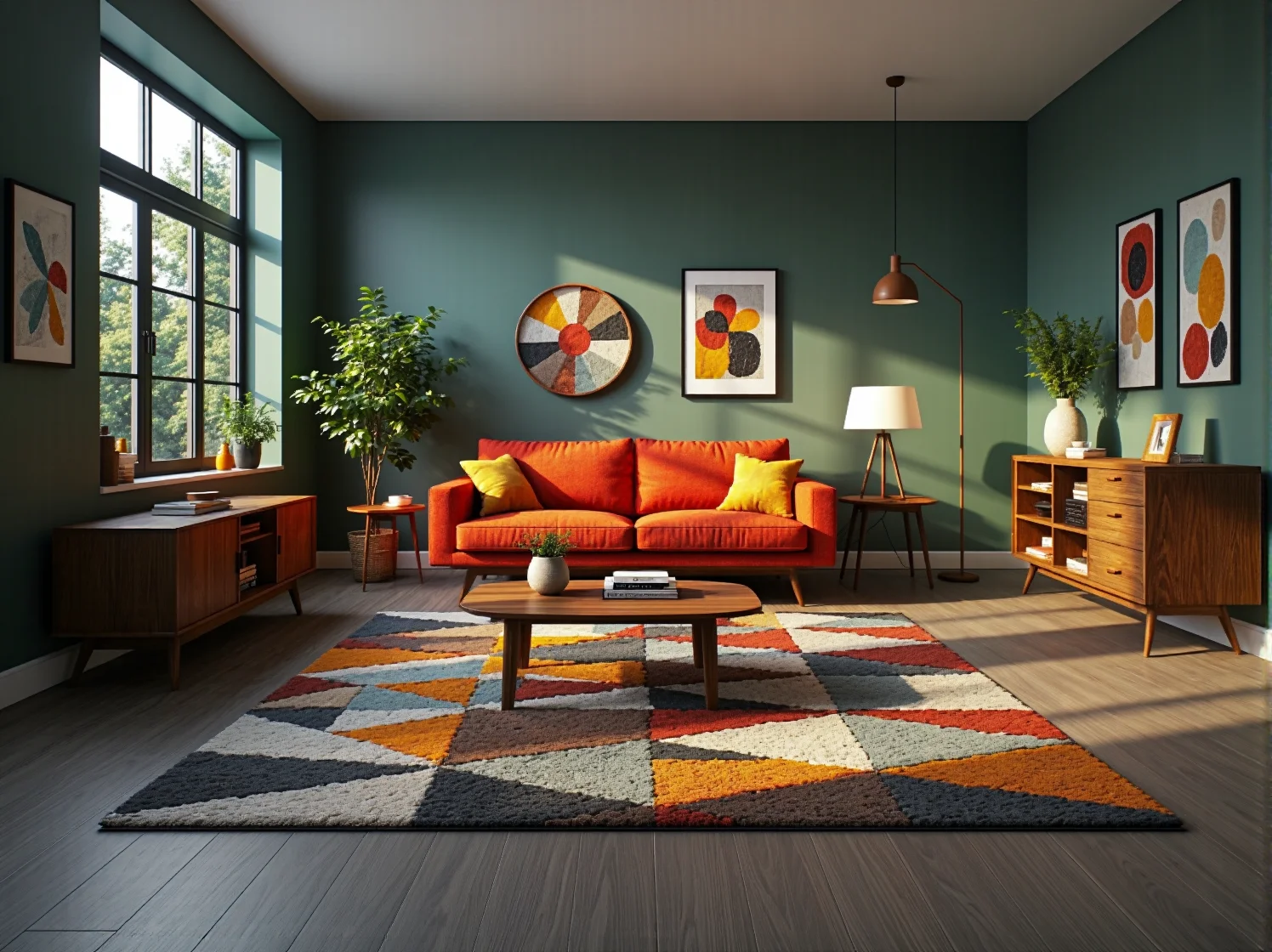 • Dodatki: Ceramiczne wazony, grafiki i plakaty w stylu retro, drewniana komoda lub regał.