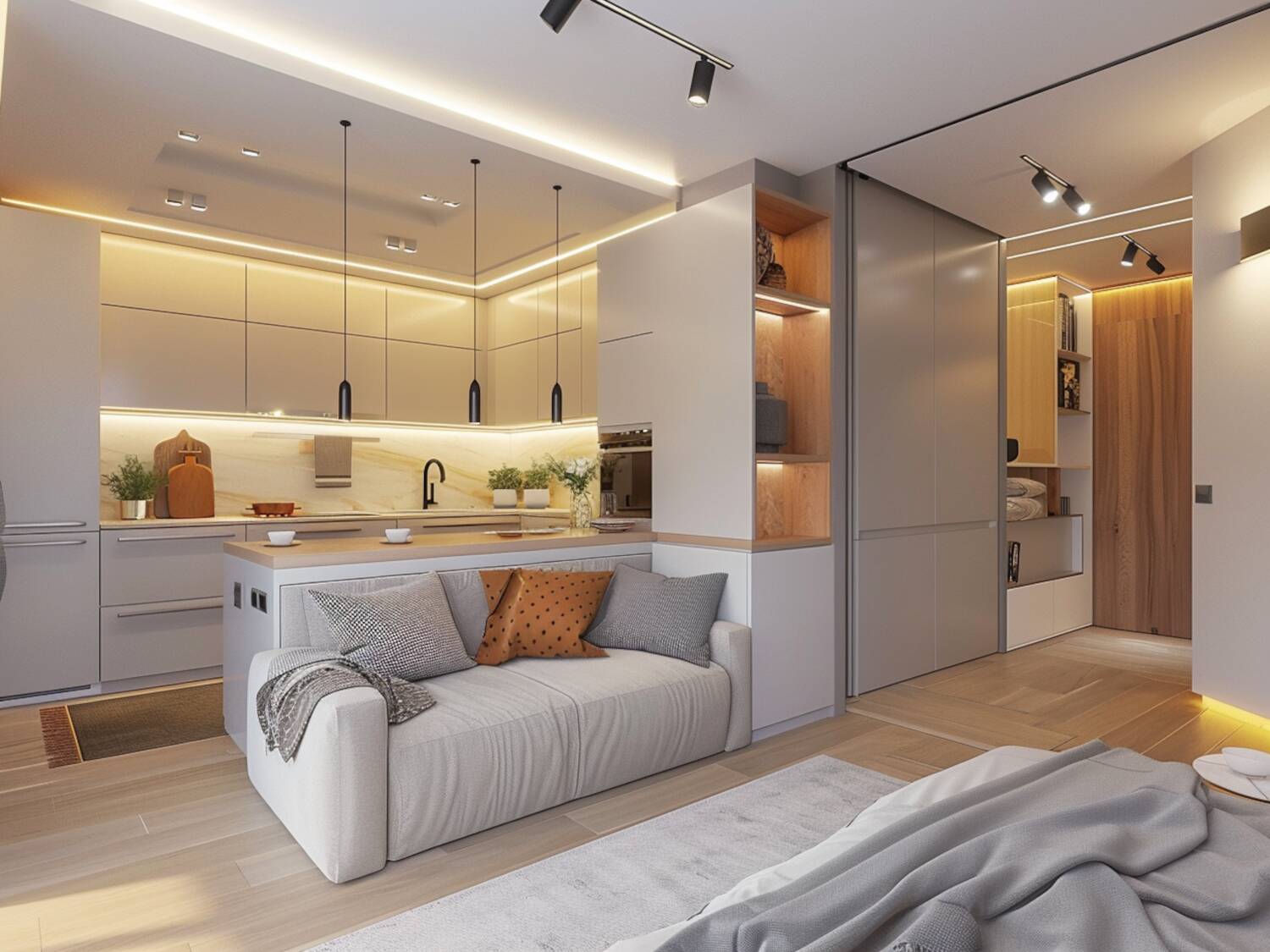 „Urban Harmony” to zestaw, który łączy w sobie tradycję z nowoczesnością. Meble tapicerowane z naturalnych tkanin, w ciepłych, harmonijnych kolorach, doskonale współgrają z minimalistycznymi dodatkami, tworząc spójną i przytulną przestrzeń. Funkcjonalne rozwiązania, takie jak rozkładana sofa i meble modułowe, pozwalają na optymalne wykorzystanie małej powierzchni, czyniąc ten zestaw idealnym wyborem dla mikroapartamentów.